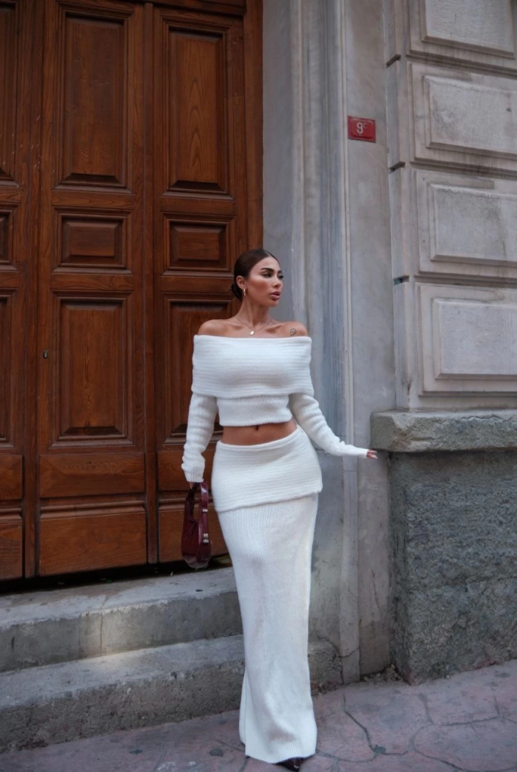 Straplez , Madonna , Carmen Yaka Croplu Uzun Etekli ikili Takım Triko - Beyaz