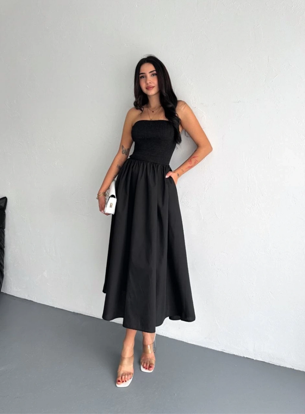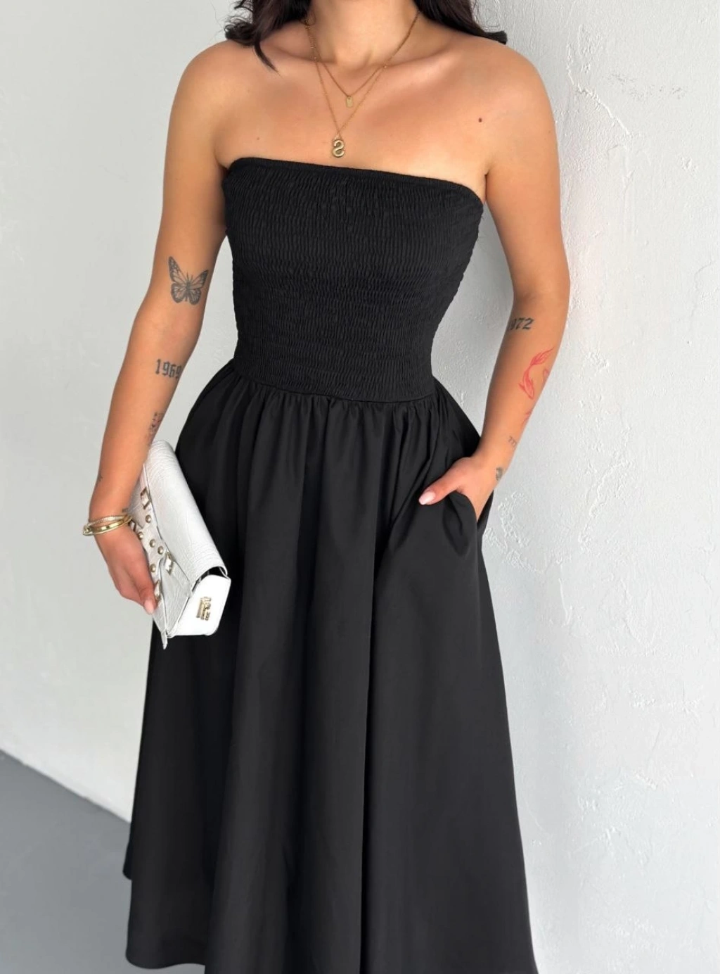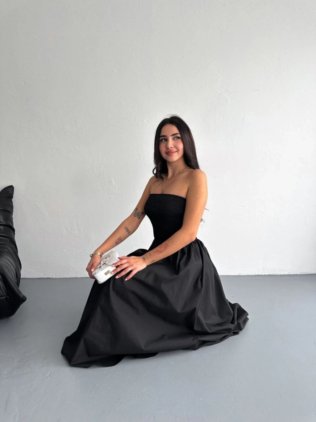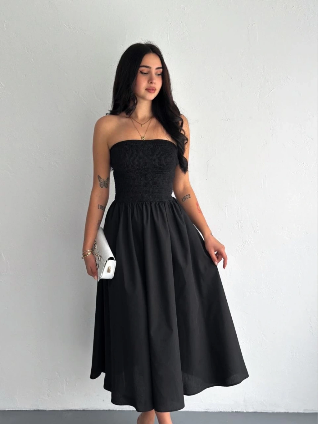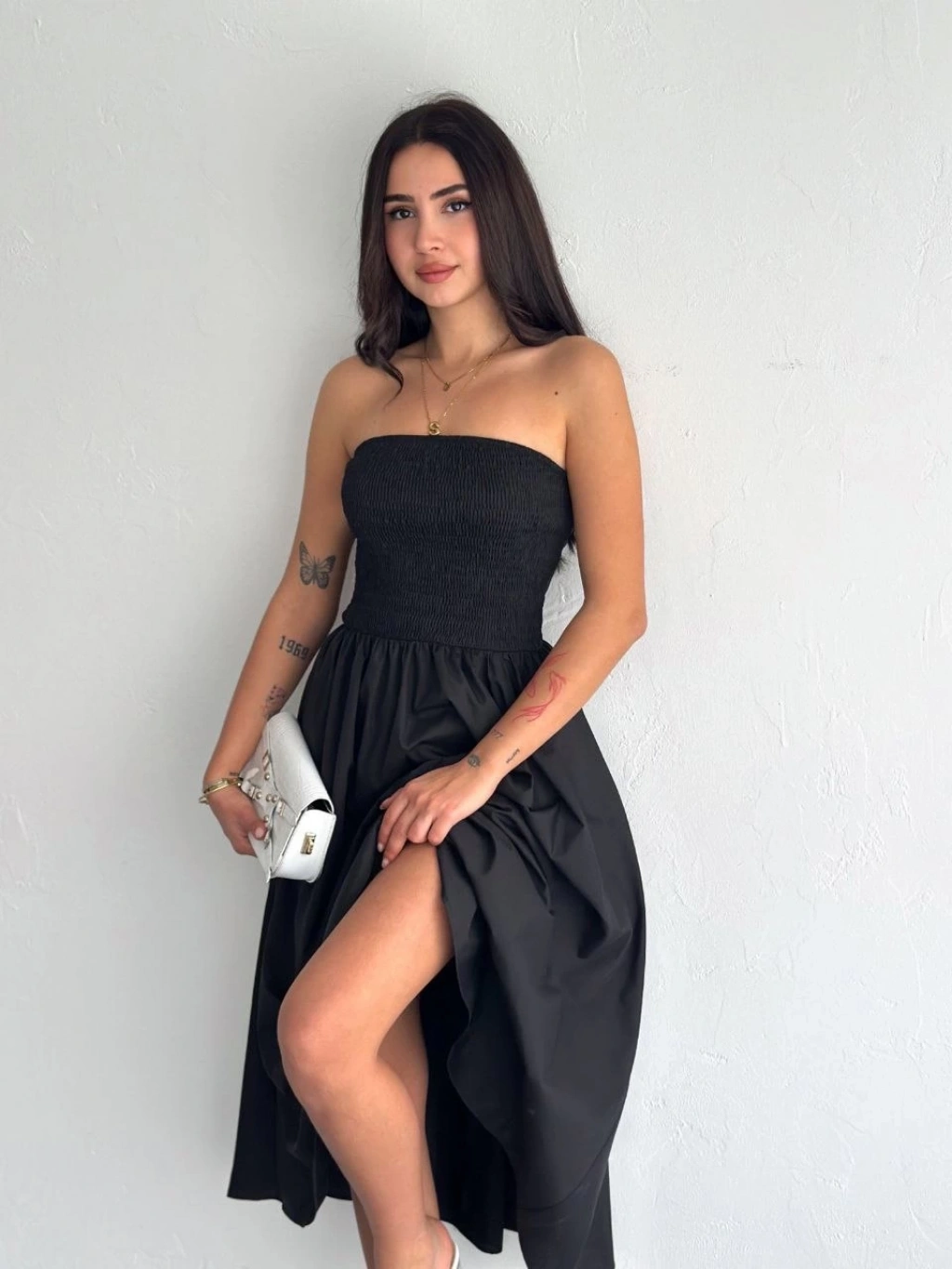 Sırt Bağlamalı Derin Yirtmaç Askılı Elbise - Siyah