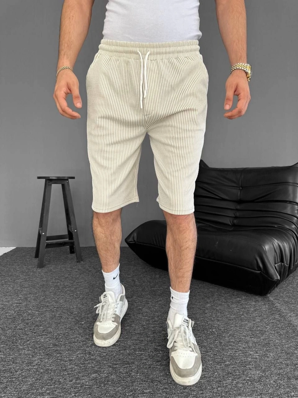 Su Yolu Çizgili Ön Arka Cepli Şort Yazlık Nefes Alabilir - Bej