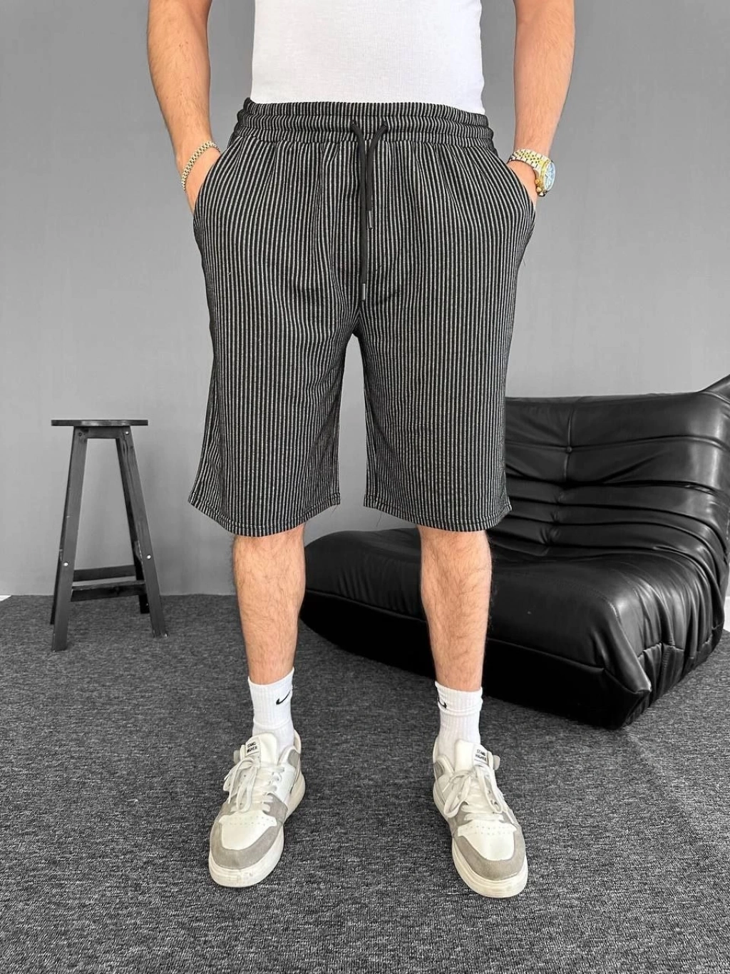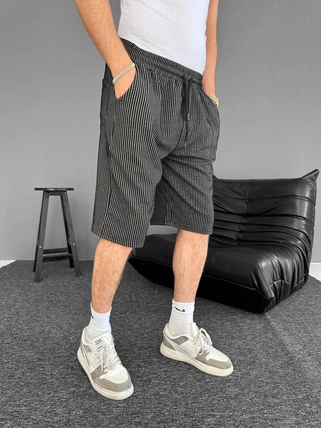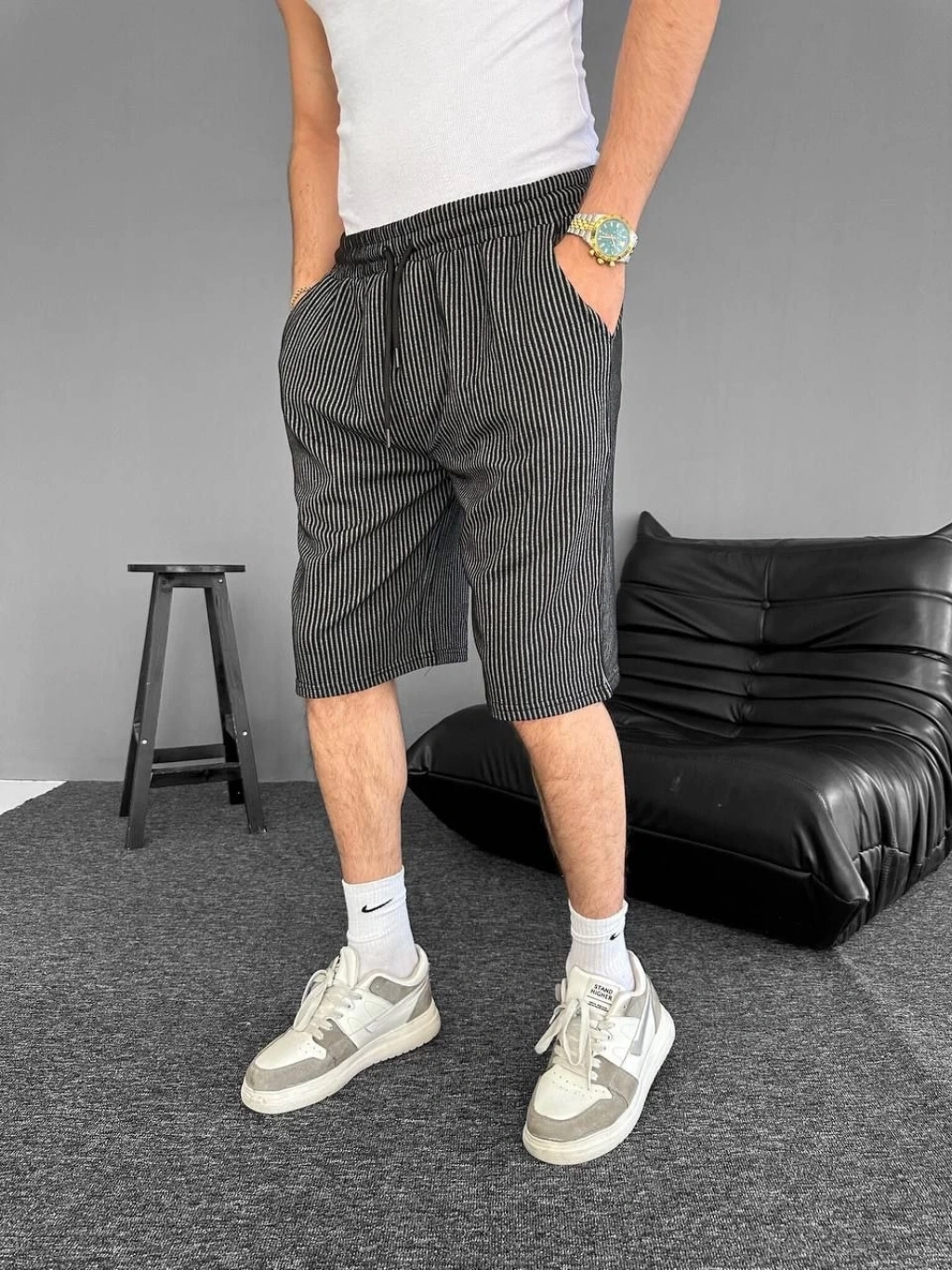 Su Yolu Çizgili Ön Arka Cepli Şort Yazlık Nefes Alabilir - Siyah