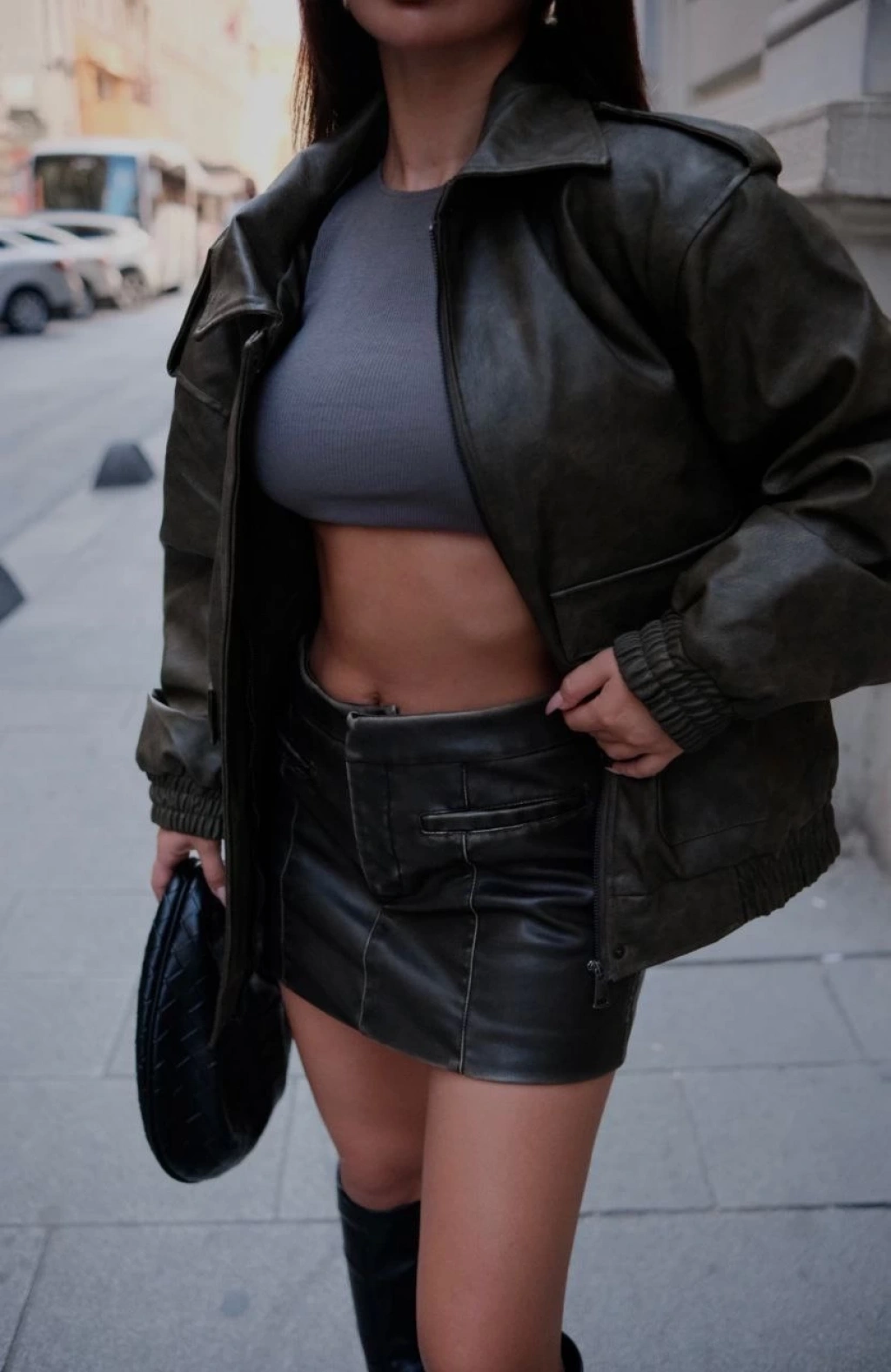 Deri Yakalı Pamuk dokulu Çift Taraflı Çalışan Fermuar Ceket - Füme