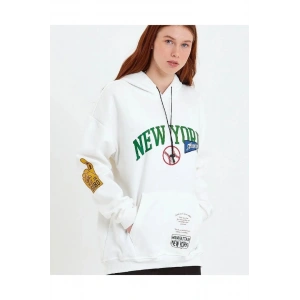 Baskılı Üç İplik Kapüşonlu Oversize Sweatshirt - Beyaz