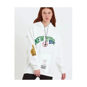 Kadın Baskılı Kapüşonlu Sweatshirt - Beyaz