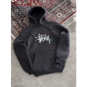 ÜÇ İPLİK KAPŞONLU BASKILI SWEATSHİRT - SİYAH