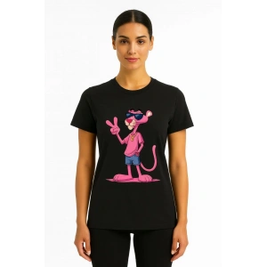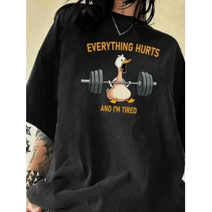 ÖRDEK BASKILI VE YUVARLAK YAKALI KADIN GÜNLÜK BÜYÜK BOY SİYAH TİŞÖRT. - SİYAH