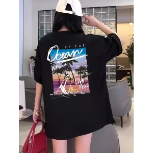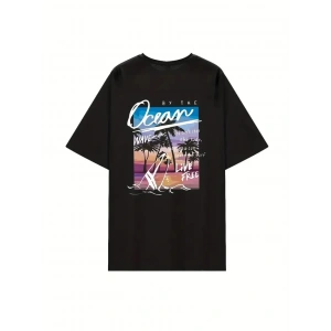 KADINLAR İÇİN GENİŞ KESİM TİŞÖRT - KISA KOLLU, BOL KESİM, MANZARALI OKYANUS BASKI, GÜNLÜK YAZLIK ÜST, SİYAH- SİYAH