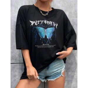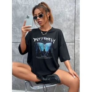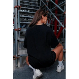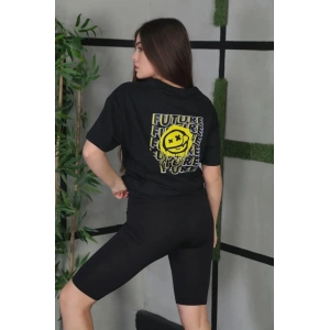 KADIN BİSİKLET YAKA BASKILI OVERSİZE T-SHİRT - SİYAH