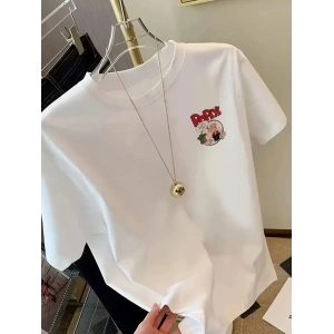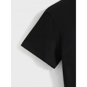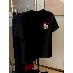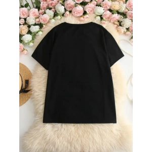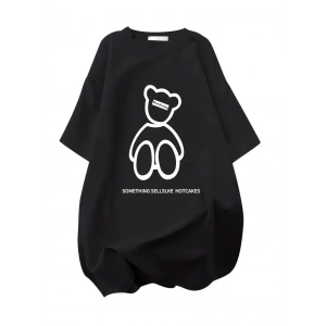 BÜYÜK BOY AYICIK BASKILI BİSİKLET YAKA T-SHİRT, İLKBAHAR & YAZ İÇİN RAHAT KISA KOLLU T-SHİRT, KADIN GİYİM - SİYAH
