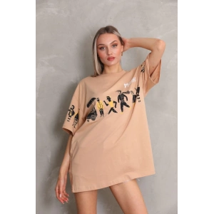 UNİSEX BİSİKLET YAKA BASKILI OVERSİZE T-SHİRT - BEJ