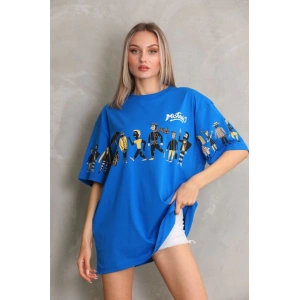 UNİSEX BİSİKLET YAKA BASKILI OVERSİZE T-SHİRT - MAVİ