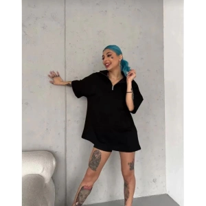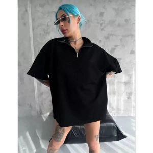UNİSEX YARIM FERMUARLI DÜZ OVERSİZE T-SHİRT - SİYAH