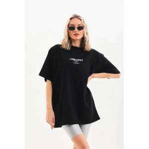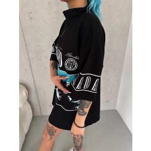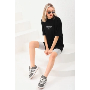 Kadın Bisiklet Yakalı Sırt Baskılı Oversize T-Shirt - Siyah