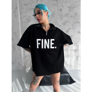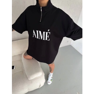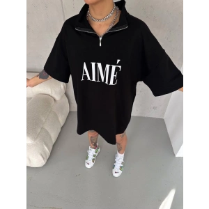 Unisex Yarım Fermuarlı Baskılı T-Shirt - Siyah