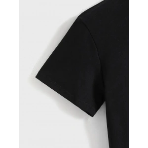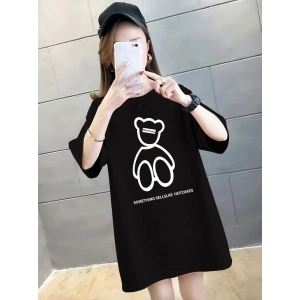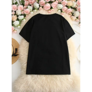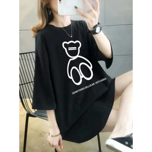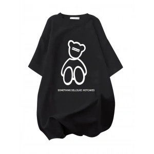 Büyük Boy Ayıcık Baskılı Bisiklet Yaka T-Shirt, İlkbahar & Yaz İçin Rahat Kısa Kollu T-Shirt, Kadın Giyim - Siyah