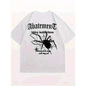 Örümcek Ağı Desenli Baskılı Oversize Bisiklet Yaka T-shirt - Beyaz