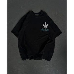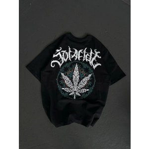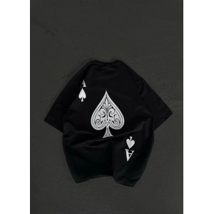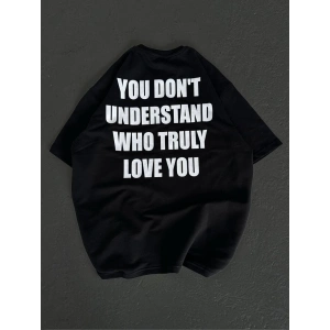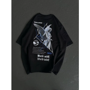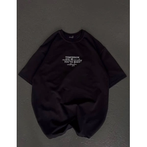 Unisex Bisiklet Yaka Baskılı Oversize T-Shirt - Siyah