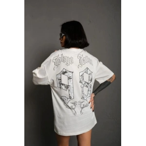 Unisex Bisiklet Yaka Baskılı Oversize T-Shirt - Beyaz