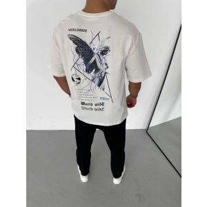 Unisex Bisiklet Yaka Baskılı Oversize T-Shirt - Beyaz