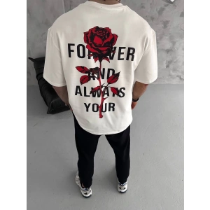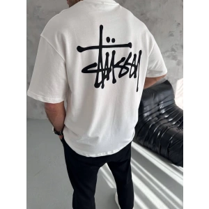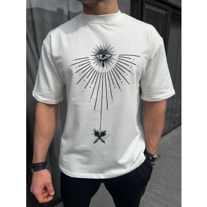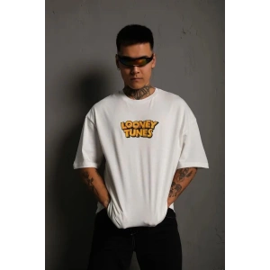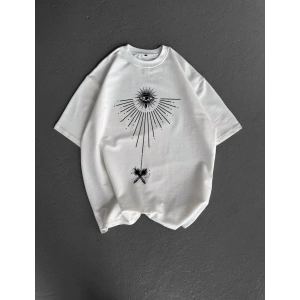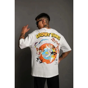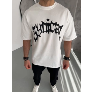 Unisex Bisiklet Yaka Baskılı Oversize T-Shirt - Beyaz