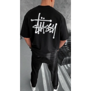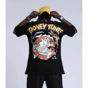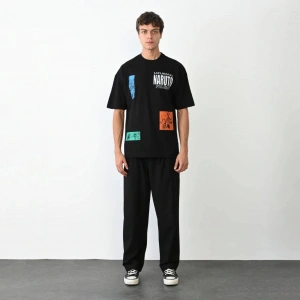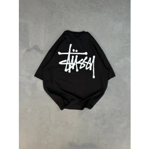 Unisex Bisiklet Yaka Baskılı Oversize T-Shirt - Siyah