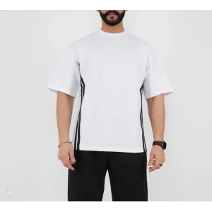 Unisex Oversize Yanları Şeritli T-Shirt - Beyaz