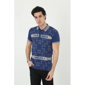 Erkek Yakalı Slim Fit Baskılı T-Shirt - Mavi