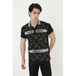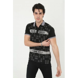 Erkek Yakalı Slim Fit Baskılı T-Shirt - Siyah
