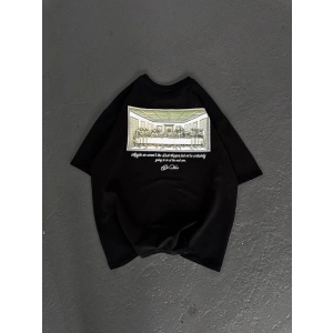 Unisex Kuşgözü Detaylı Baskılı Oversize T-Shirt - Siyah