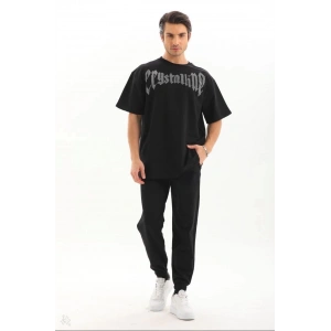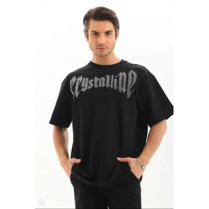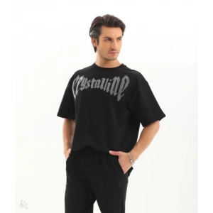 Unisex Oversize Taşlı T-Shirt - Siyah