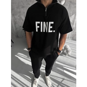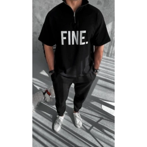 Unisex Baskılı Yarım Fermuarlı T-Shirt - Siyah