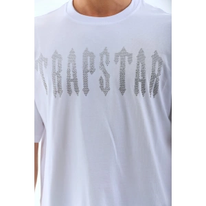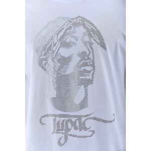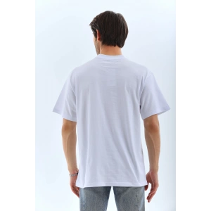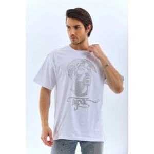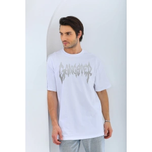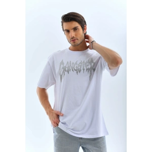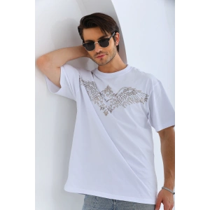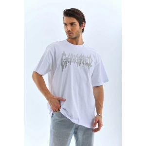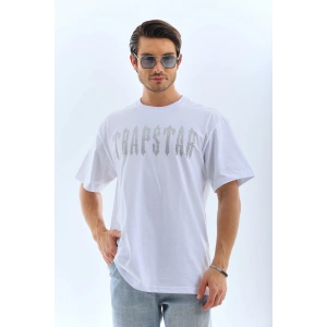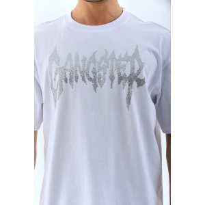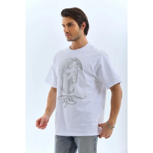 Unisex Oversize Taşlı Bisiklet Yaka T-Shirt - Beyaz