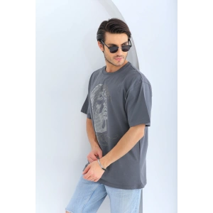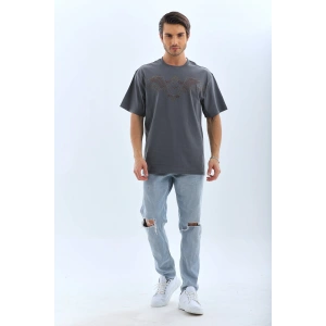 Unisex Oversize Taşlı Bisiklet Yaka T-Shirt - Füme