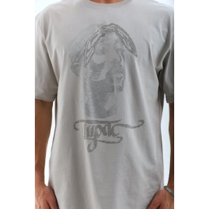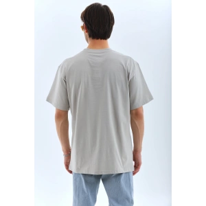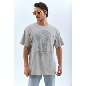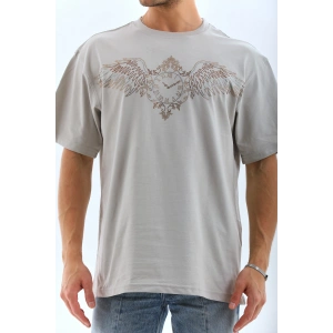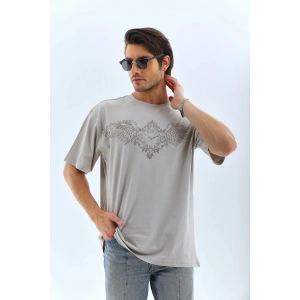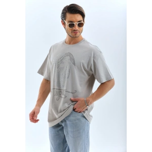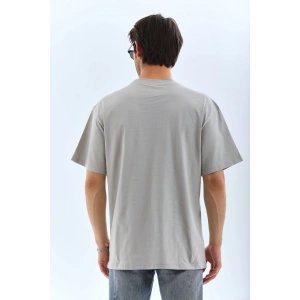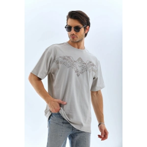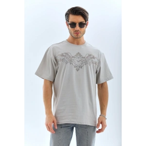 Unisex Oversize Taşlı Bisiklet Yaka T-Shirt - Gri