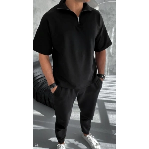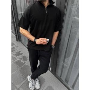 Unisex Yarım Fermuarlı Basic T-Shirt - Siyah