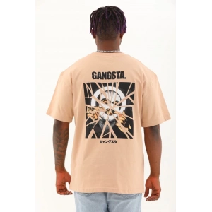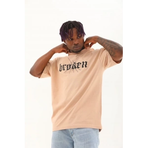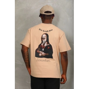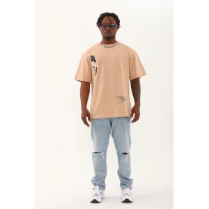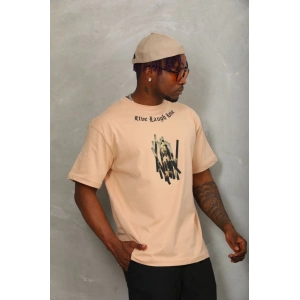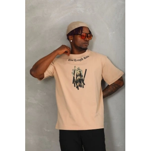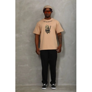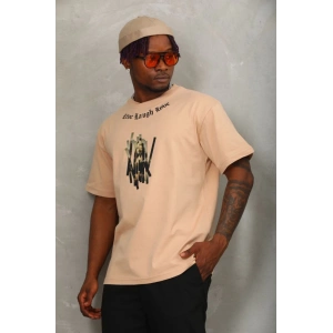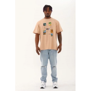 Unisex Oversize Baskılı Bisiklet Yaka T-Shirt - Bej