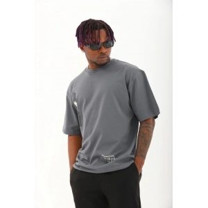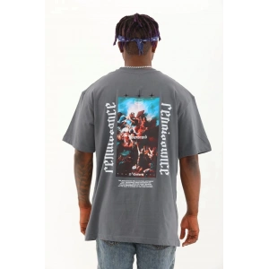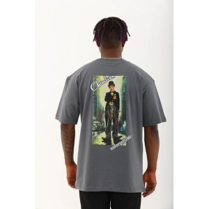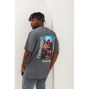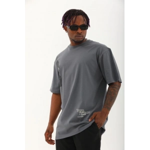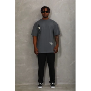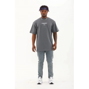 Unisex Oversize Baskılı Bisiklet Yaka T-Shirt - Füme