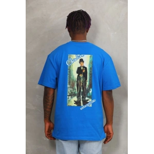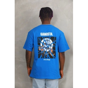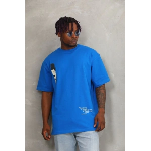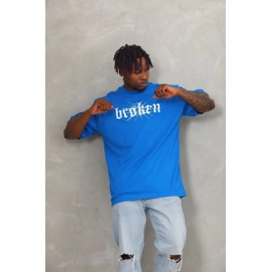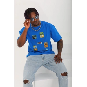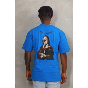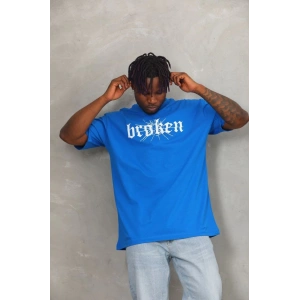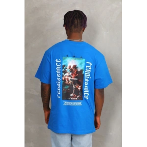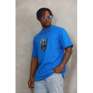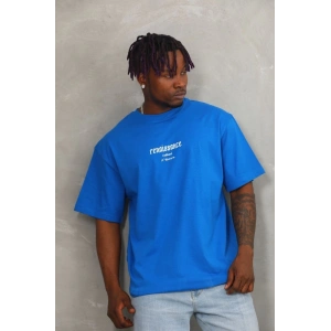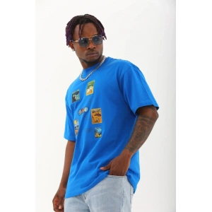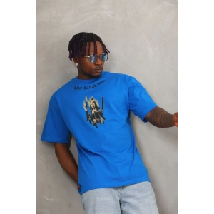 Unisex Oversize Baskılı Bisiklet Yaka T-Shirt - Mavi