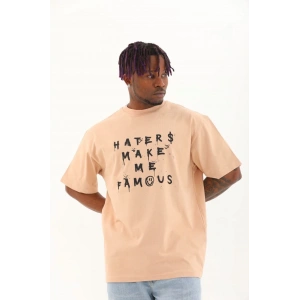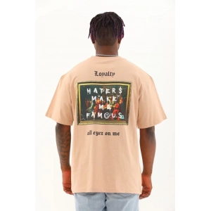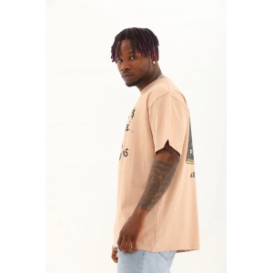 Unisex Oversize Baskılı Bisiklet Yaka T-Shirt - Bej