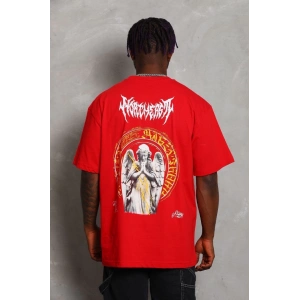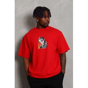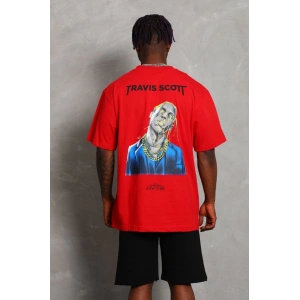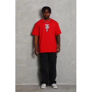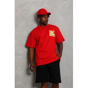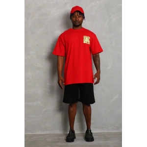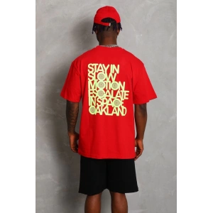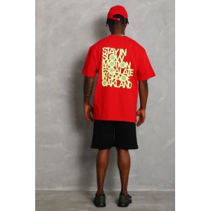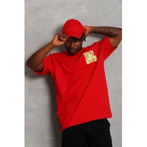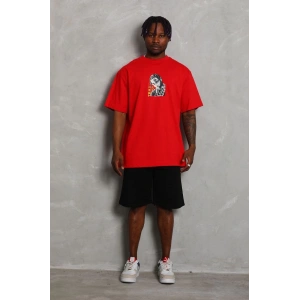Unisex Oversize Baskılı Bisiklet Yaka T-Shirt - Kırmızı