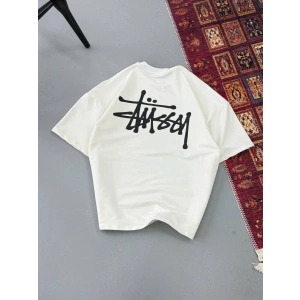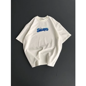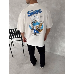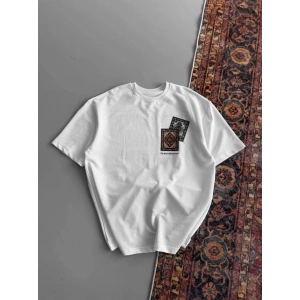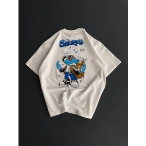 Ön ve Arka Baskılı Oversize Bisiklet Yaka T-shirt- Beyaz