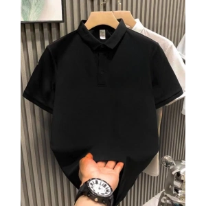 Yakası Düğmeli Yakalı Pike Düz T-Shirt - Siyah