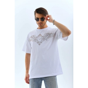 Unisex Oversize Taşlı Bisiklet Yaka T-Shirt - Beyaz
