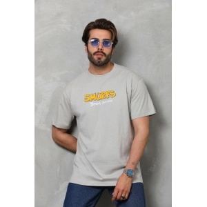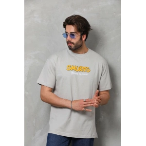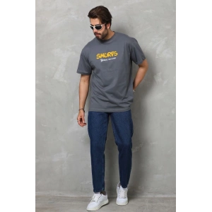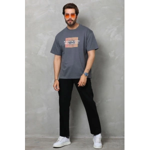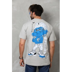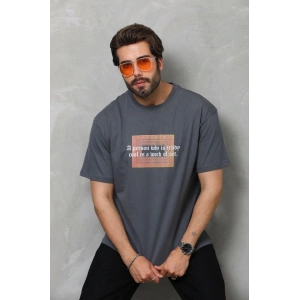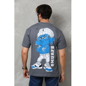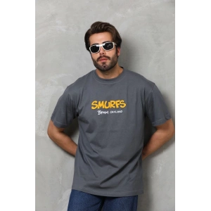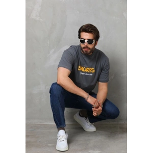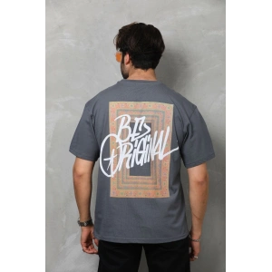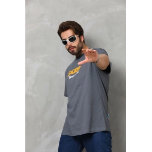 Unisex Bisiklet Yaka Baskılı Oversize T-Shirt - Füme
