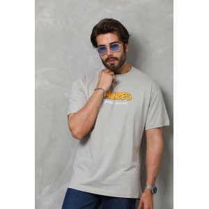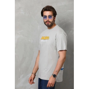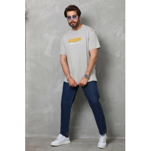 Unisex Bisiklet Yaka Baskılı Oversize T-Shirt - Gri