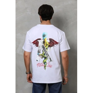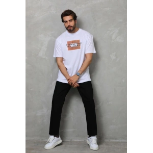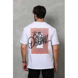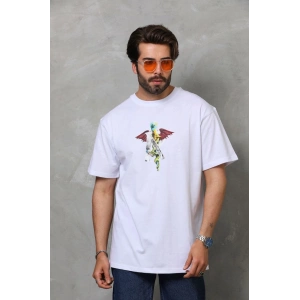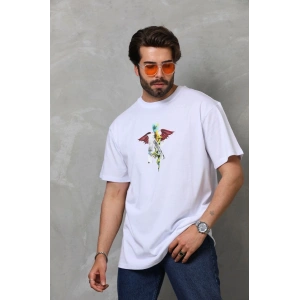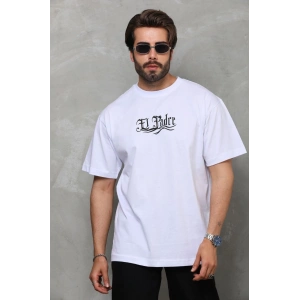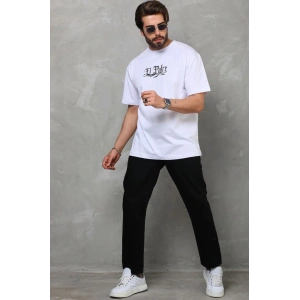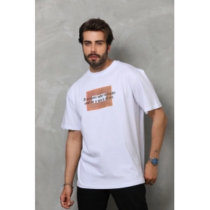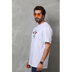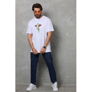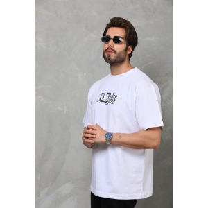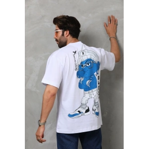 Unisex Bisiklet Yaka Baskılı Oversize T-Shirt - Beyaz