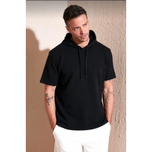 Unisex Kapşonlu Kısa Kol Düz Oversize T-shirt - Siyah