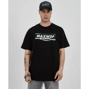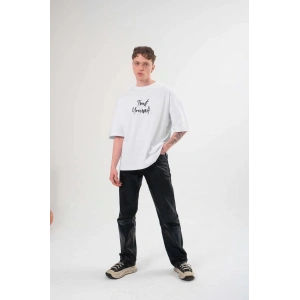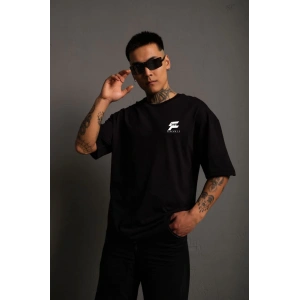 Unisex Bisiklet Yaka Baskılı Parçalı Oversize T-Shirt - Siyah
