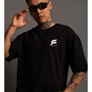 Unisex Bisiklet Yaka Baskılı Oversize T-Shirt - Siyah