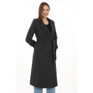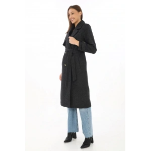 Premium Kadın Kaşe Kaban Uzun Boy, Balık Sırtı Yünlü Kaşmir Dokuma, Kruvaze Kuşaklı Astarlı - Siyah