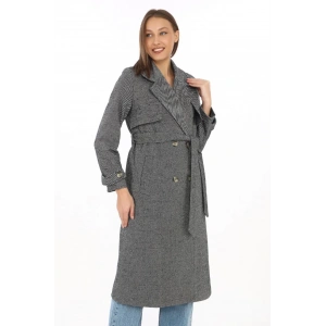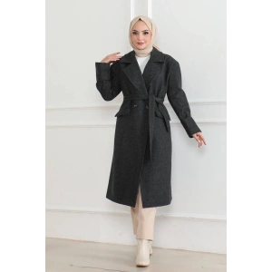 Kadın Uzun Kaşe Kaban – Balık Sırtı Dokuma Kaşmir Kumaş, Kruvaze Yaka, Kuşaklı Cepli Model, Oversize Rahat Kalıp - Boyalı Gri